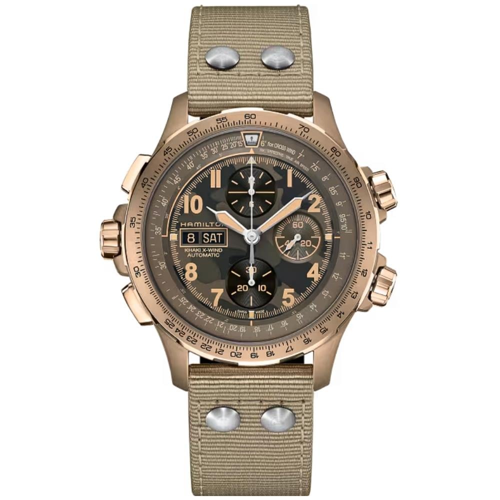 Pilotlar düşünülerek ve macera dolu bir hayat için tasarlanmış olan Khaki Aviation X-Wind Automatic Chronograph, kadran, kayış ve kasaya kadar uzanan kamuflaj desenleri ve yeni renk varyasyonlarına sahip cesur kostümüyle yan rüzgarların arasından uçuyor. Döner bir dahili bezele ve anti manyetik bir silikon zembereğe sahip bu yüksek performanslı parça, dövüş stiline ve iddialı bir görünüme sahip.